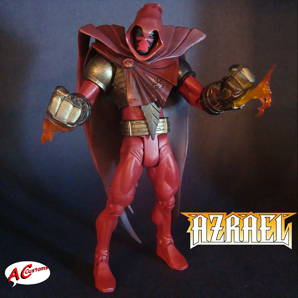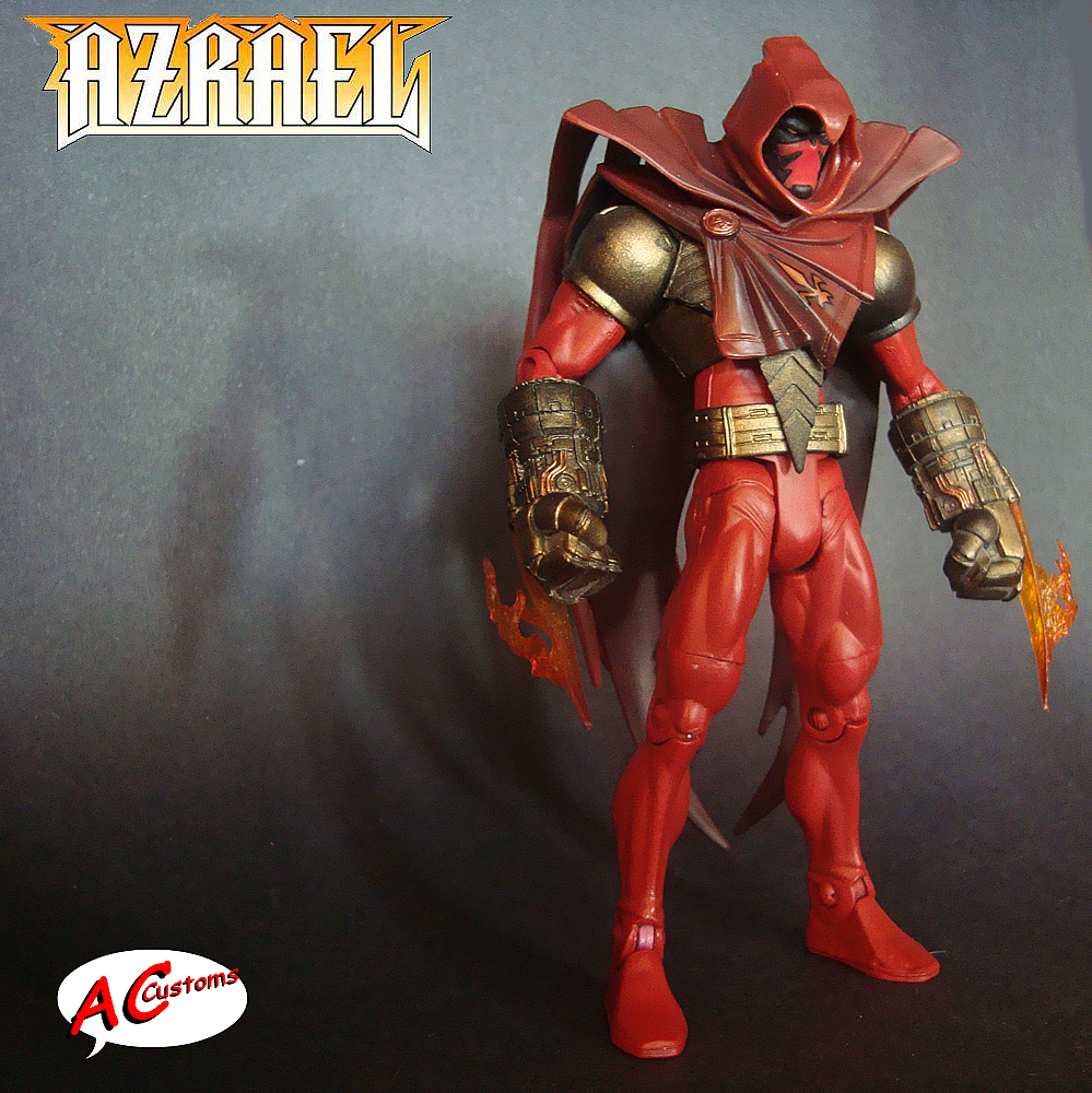 So here we are. This one is more of a well needed modification than a custom. The DCU “Four Horsemen” made a pretty detailed sculpt of Azrael, but really dropped the ball when they gave him those spaghetti legs that wouldn’t allow the figure to stand up straight, so I replaced them and gave his paint job a brighter touch up. Their design was more gargoyle; I made him more superhero. Now if I could just figure something out for his neck! Enjoy!