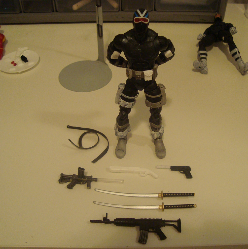 Formula = ML Bullseye body, DCUC Vigilante head, lots of pouches and gun straps, and a custom paint job and weapons. The weapons are my favorite bit. The grenades are sculpted and painted, his guns are pretty unique, based on familiar designs but I took a few liberties. And his swords have the Chinese hexagram and the sculpted claw on the hilt. Enjoy!