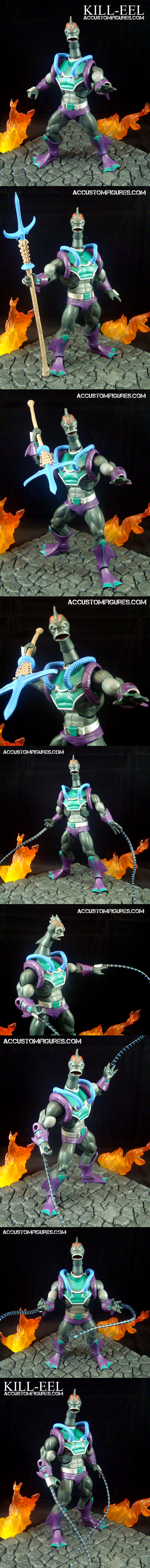 Kill-Eel was make from a MOTUC buck, Hydron legs and forearms, Mer-Man hands, Count Marzo modded chest piece, ML Constrictor tentacles, DCUC GL head, neck from some dragon toy, and fodder. Finished him with a classic MOTU paint job. Enjoy!