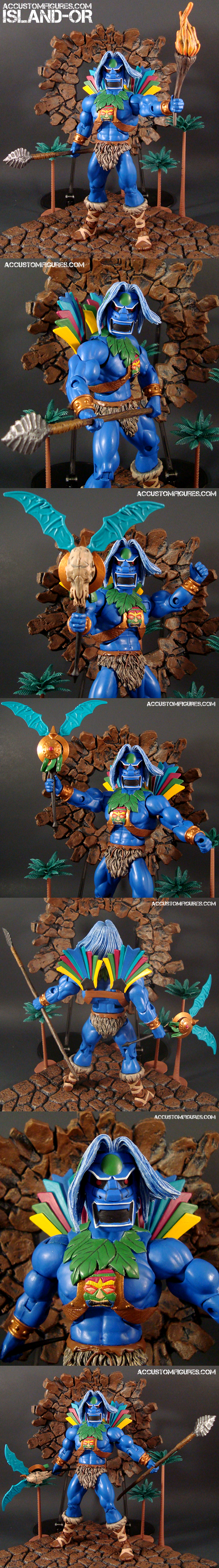 Islandor was made from a He-Man base with a fodder mask over an Iccarus head with Count Marzo hair, Redaki feathers and Oolaar skirt. He has sculpted leaves and tiki god on his chest armor with details to make it look like it’s carved from wood! His totem staff is fodder parts, and his torch has sculpted detail. Wrapped up in a tropical FILMATION style paint job! Enjoy!