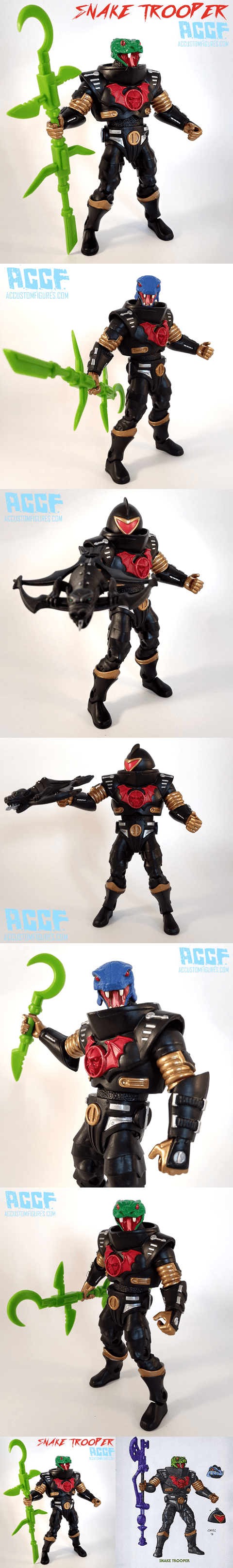 The Snake Trooper is based on concept art by the great Axel Gimenez! He was made from a MOTUC Flogg base with Horde Trooper armor, King Hisss lower body and 3 interchangeable heads. He comes with a 10 part glyos staff that is entirely interchangeable to build endless weapons. He is finished with a trademark ACCF paint job. Enjoy!