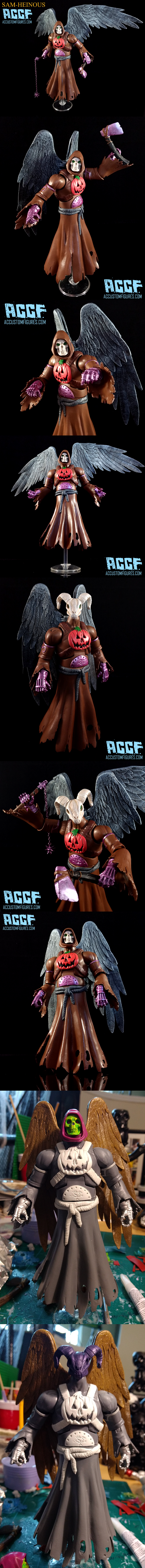 Sam-Heinous was made from a MOTUC Horde Wraith, modded Spirit Hordak hands, a MOTUC wing set, DCUC Dessaad Hood and the skull face from a MOTUC Man-E-Faces, and his alternate head is the ram from Skeletors Havoc staff. He features sculpted detail including his pumpkin chest emblem, armor, and rope. Wrapped up in a trademark ACCF MOTU style paint job. Enjoy!