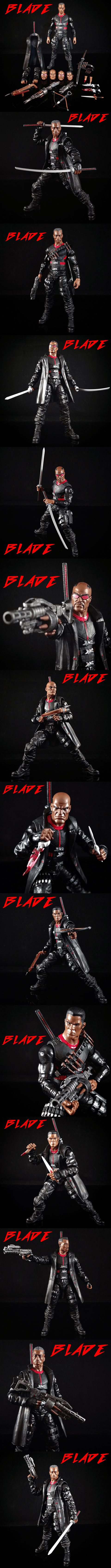 Blade the Vampire Hunter. This is the Marvel character that started so much of what we now know as the Marvel Cinematic Universe. In 1998 Blade’s first solo movie with Wesley Snipes showed Marvel Comics fans that Marvel Comics movies could be serious, dark, and bad ass! This figure pays homage to all versions of Blade from his first appearance by Marv Wolfman and Gene Colan, to Wesley Snipes movie series, the short lived Sticky Fingaz TV show, his recent comic appearances in Avengers and Mighty Avengers, and my take on his future MCU appearance that wraps him all up in a cohesive figure. He features an arsenal of weapons that represent all eras of the character and 5 interchangeable heads to match! He also comes with 2 sets of interchangeable arms that work with his jacket and non-jacket looks! He was made from parts of current Marvel Legends figures, but I also incorporated parts from the original Wesley Snipes ToyBiz figure including his head and buckles. He’s finished with different shades of black matte and gloss paints, with highlights of vibrant red! Enjoy!